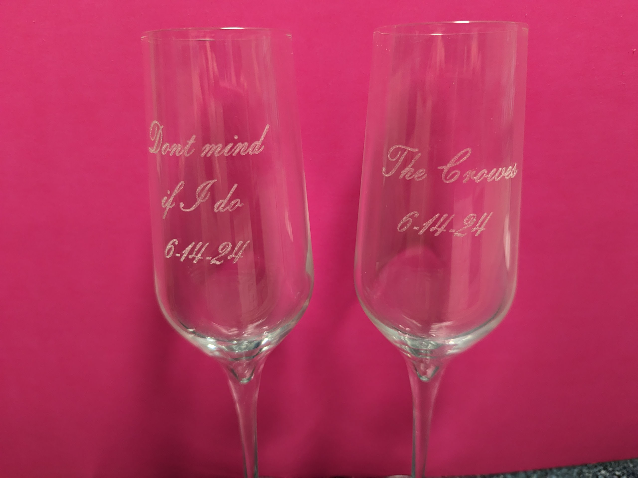 I can engrave glass items such as wine glasses, glass beer mugs, shot glasses etc. One thing I have found that doesn’t do to well is fine crystal, it seems to have some inherent stress in the glass from manufacture and sometime when the laser beam hits it will fracture. I do shy away from crystal for that reason.